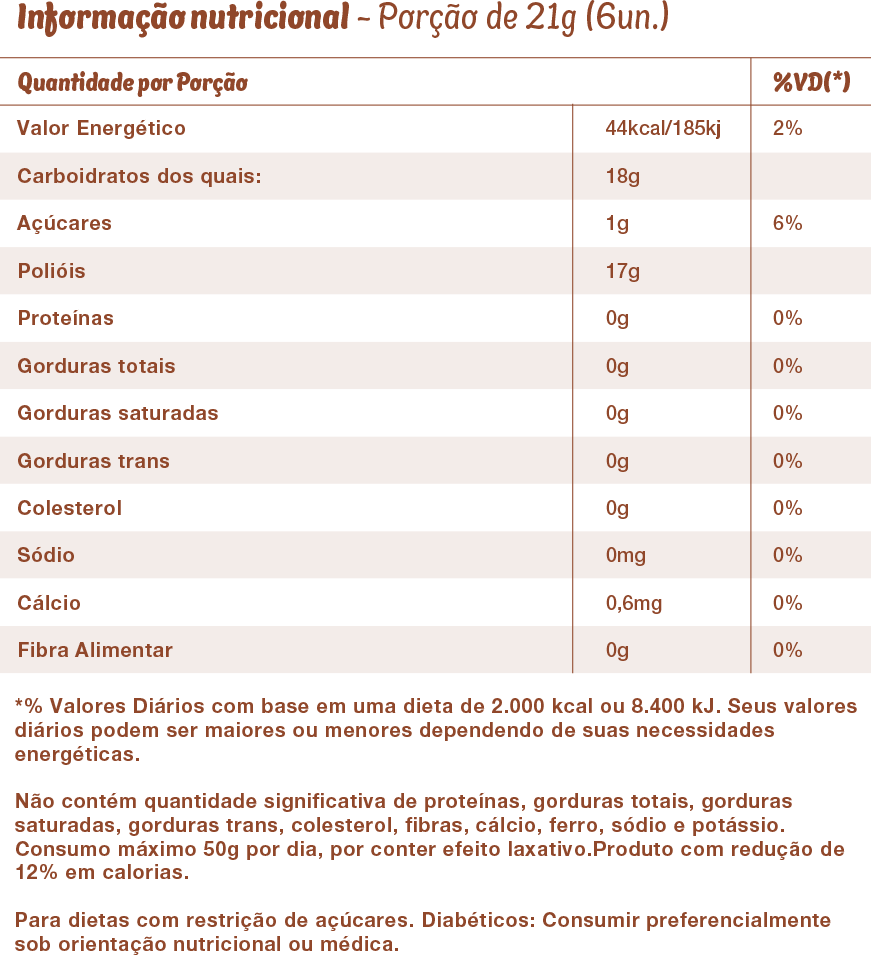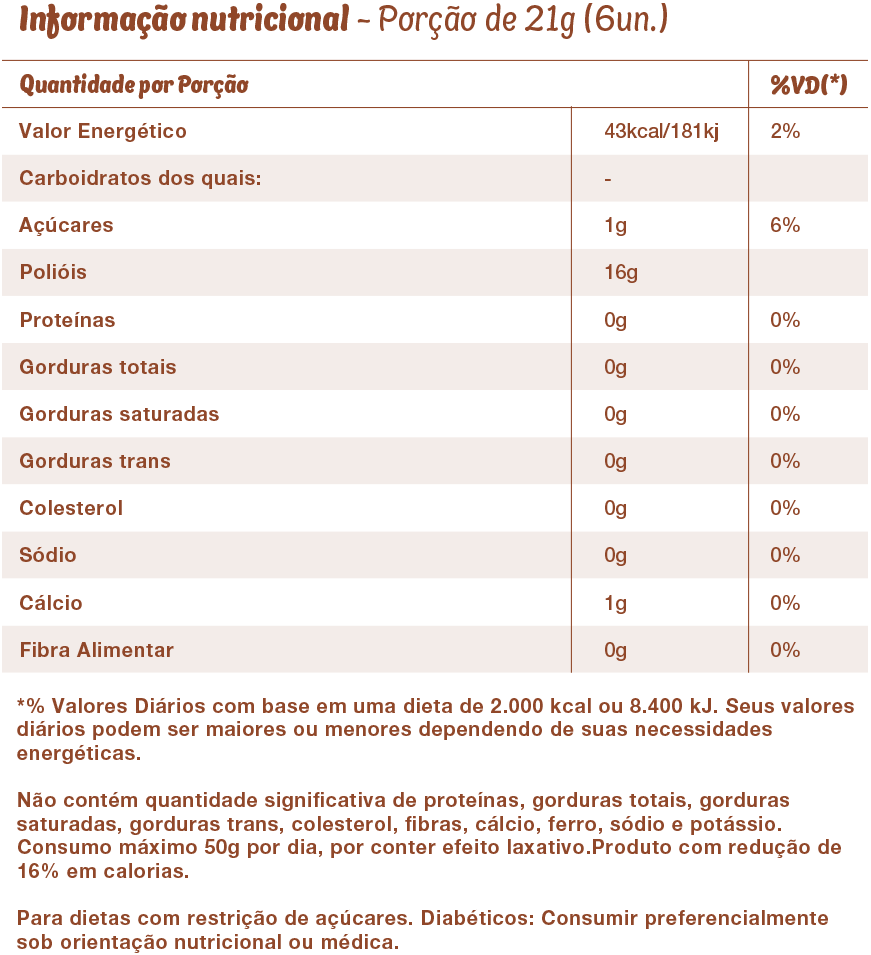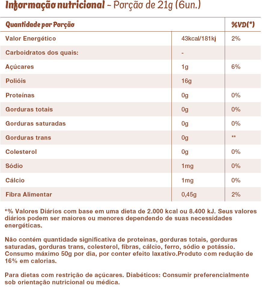 INGREDIENTES: Isomalte, Gengibre, Café Solúvel, Essência de Café, Ácido Cítrico e Sucralose.